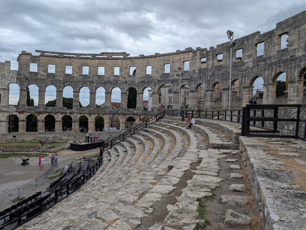 Es ging nun weiter nach Pula, was wegen diversen Baustellen eine Fahrt von knapp 3 Stunden war. Dort haben wir wieder für 3 Nächte auf dem Arena Stoja Campsite gebucht haben. Der Boden auf dem Camping dort ist sehr uneben und wir haben wohl die schlimmste Parzelle gehabt (steil, grosse Steine, etc.). Wir konnten das Wohnmobil jedoch so platzieren, dass es für die Tage funktioniert hat - auch weil wir nicht viel Zeit drinnen verbracht haben. Da der Strand im Camping Areal voller (toten) Quallen war, gingen wir gleich ausserhalb vom Camping beim Wake Park Pula baden. Dort gab es keine Quallen und hatte auch genügend Platz.